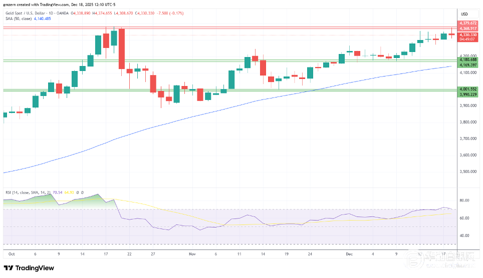 【华通白银网12月19日】•金价未能收于阻力位4370-4380美元上方。