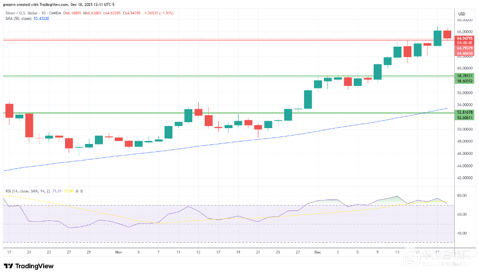 银价回落至65.00美元下方,因交易商在历史高点附近了结了部分获利。