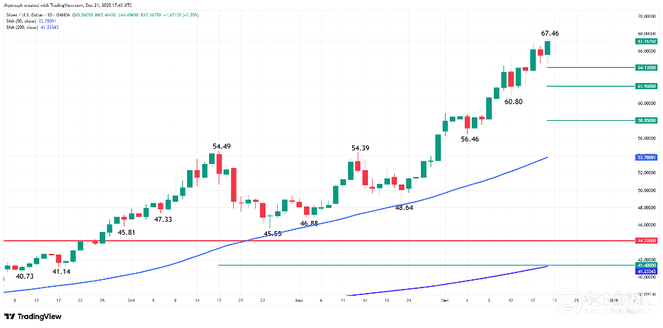 现货银上周五收于67.17美元,上涨2.55%,这一举动让人感觉多头无意放弃任何阵地。当天早些时候,现货价格甚至触及67.46美元,收盘时略有回落,对于一个连续几周火爆的市场来说,这是正常的水平。白银连续第四周上涨,本周涨幅约为8.48%,今年迄今已大幅上涨120%。黄金今年也表现强劲,但白银继续跑赢黄金。