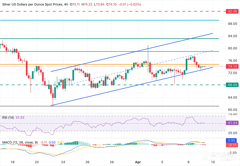 【华通白银网4月10日讯】•白银从77.65美元的周高点回落后,在74.00美元附近波动。