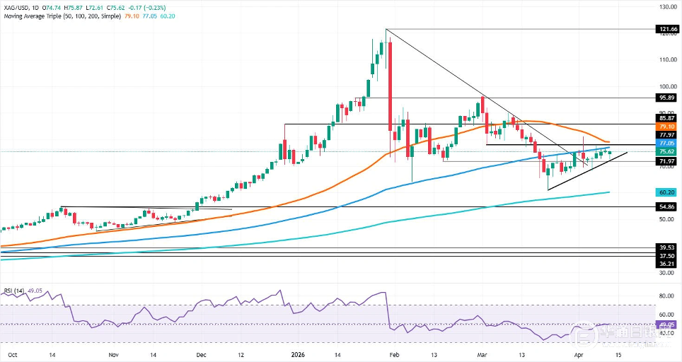 如果白银向上突破100日移动均线,下一个目标位将是3月3日形成的阻力位77.98美元,其上方是50日移动均线79.21美元。下行方面,若白银跌破20日移动均线73.28美元,空头可能会将银价推至4月2日低点69.58美元,随后进一步朝3月23日周期低点60.95美元迈进。