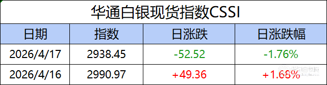 华通白银现货指数CSSI走势日报,今日指数2938.45,日涨跌-52.52,日涨跌幅-1.76%